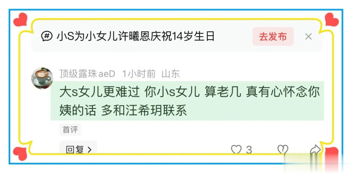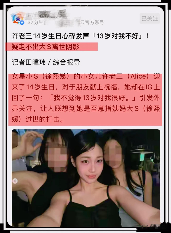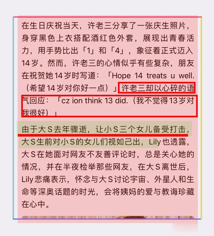 另外台媒报道前天小S小女儿许老三14岁生日,在网上晒出庆生照片,在评论区回复好友:13岁对她并不友好,台媒称大S去世对小S三个女儿打击很大,因为大S生前特别疼她们,所以许老三疑似没有从大S离世的阴霾走出!