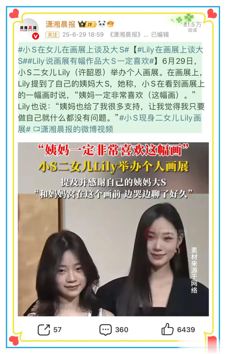 大S去世以后小S二女儿开画展提大S,出席活动提大S,小S大女儿二女儿拍杂志也提大S,小S复出录制节目也提大S,确实是对大S的离开难以释怀!一时半会走不出来也很正常!