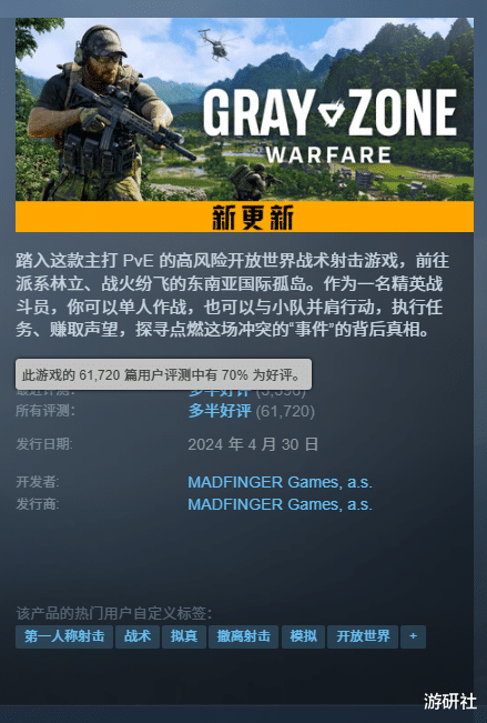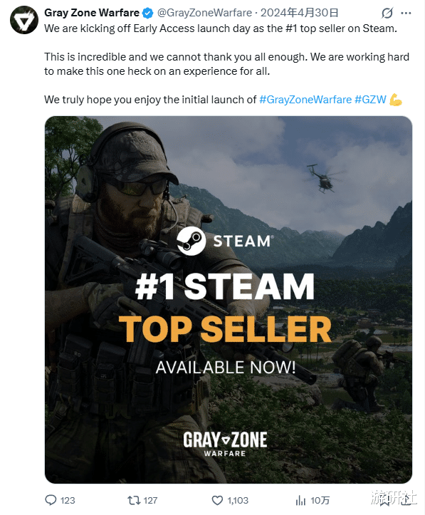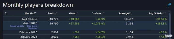 4月3日,军事题材撤离射击游戏《灰区战争》官方发了篇日志,提到有超过16万玩家参与体验了灰区的0.4版本更新,月度玩家峰值更是增长了1076%。
