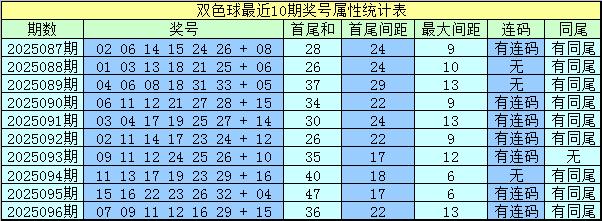 上期开奖:福彩双色球第2025096奖号为:07 09 11 12 16 29 + 15,红球和值为84,最大间距为13,奇偶比为4:2,三区比为3:2:1。
