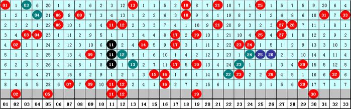 2、凤尾分析:最近十期凤尾号码分布在24-33区间,走势比较集中,凤尾在29两端次数比为2:8,凤尾在29以上出现较少,本期防29以上凤尾回补,看好号码30。