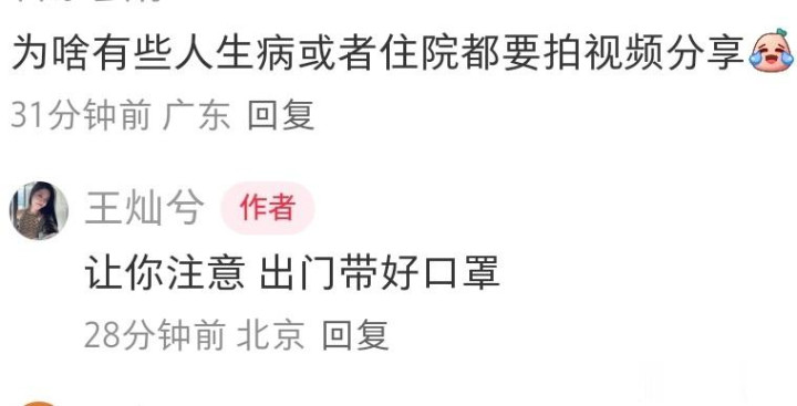 王灿总是把自己的家事搬到网络上让人讨论,经常有人表示不能理解,就像这次孩子生病住院,王灿拍视频就被质疑:为啥有些人生病都要拍视频分享?王灿很大气回应了这位网友:让你注意,出门戴好口罩,语气不急不躁,心态比以前平和很多了。