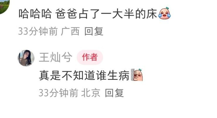 有粉丝指出,爸爸占了一大半床,明明是小蛋饺生病了,却被挤到角落里坐着,王灿也很配合吐槽自己老公:真是不知道谁生病。