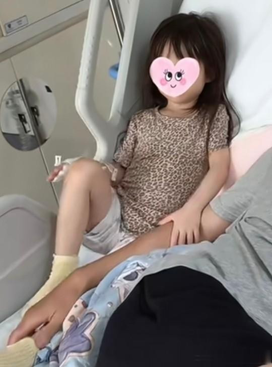 4岁小蛋饺穿着花纹短袖,长头发披散着,手上扎了留置针正在吊药水,小家伙手还放在杜淳胳膊上,父女俩很亲近。