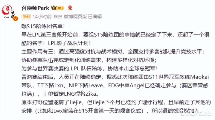 九月底的时候,Doinb就在直播时爆料,LPL官方今年为了赛区成绩,组建了世界赛陪练团,具体的陪练选手,之前一直没有消息,直到最近,才有博主发文爆料陪练阵容,世界冠军教练茂凯带队,NIP下路Leave,EDG中单Angel,都已经确定参与陪练,上路暂定ZIka(可能还会调整)。