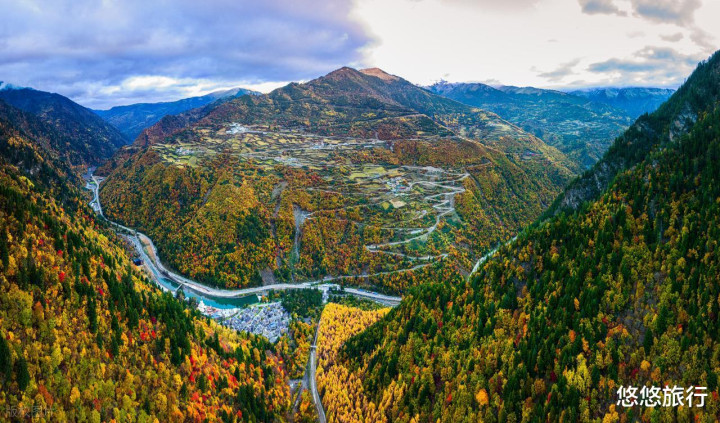 羊茸哈德藏寨,经幡摇曳,山谷之间是奶子沟彩林,八十里彩林画廊,层林尽染,一步一景。雪山下的古尔沟温泉,白日赏秋,夜晚泡汤。