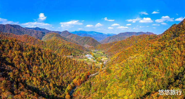 干净的柏油路两旁笔直地立着一排排水杉、银杏、刺槐等树种,一路绵延成林的浓浓秋色。途径石门子的溪流、水杉、田园风光,柴关岭有着层林尽染的壮阔,千年古银杏树满地金黄。