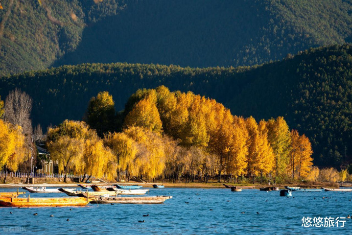 11月的泸沽湖秋意渐浓,树叶金黄,树叶金黄,天空透蓝。第一批过冬的红嘴鸥已经抵达,盘旋在湖面。