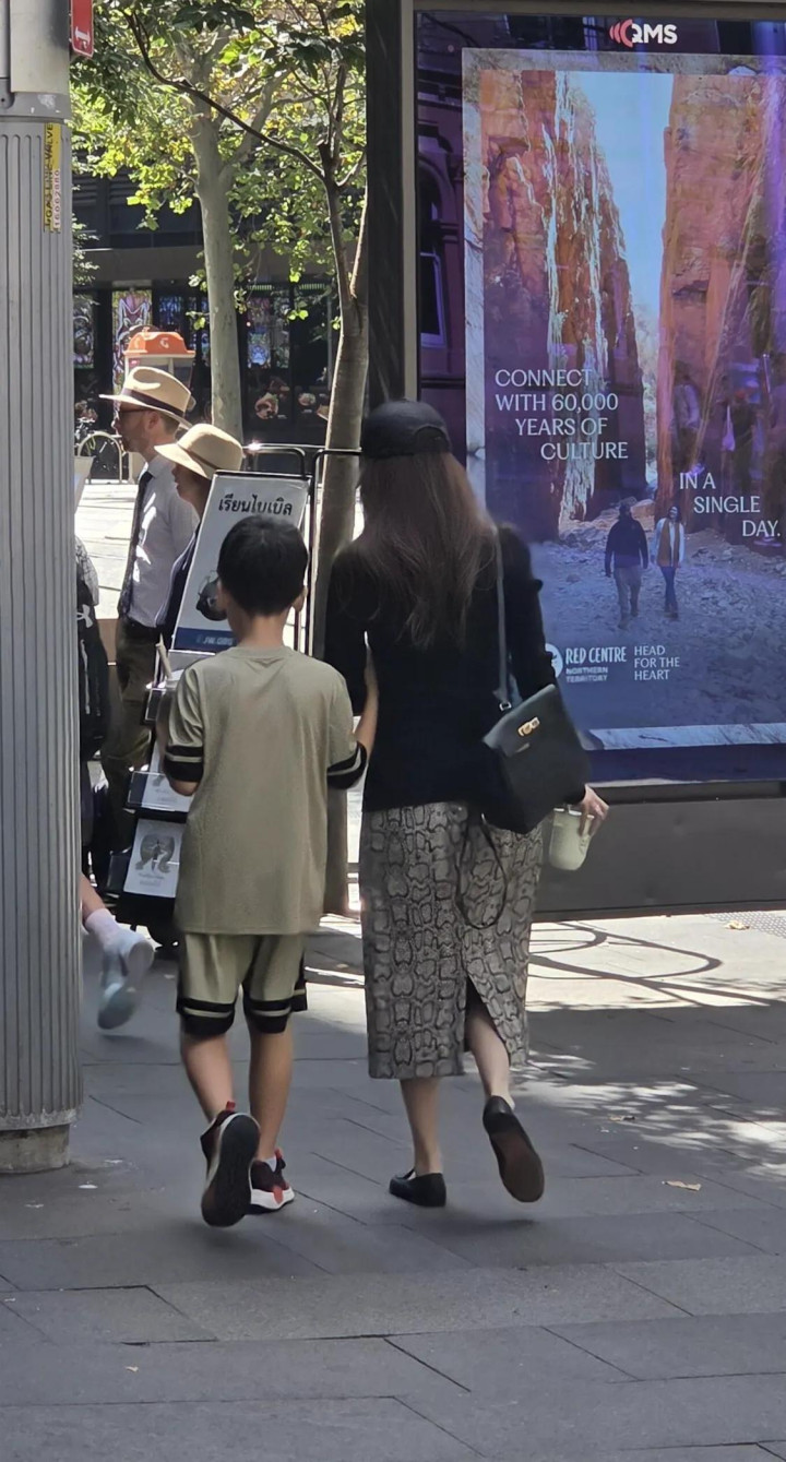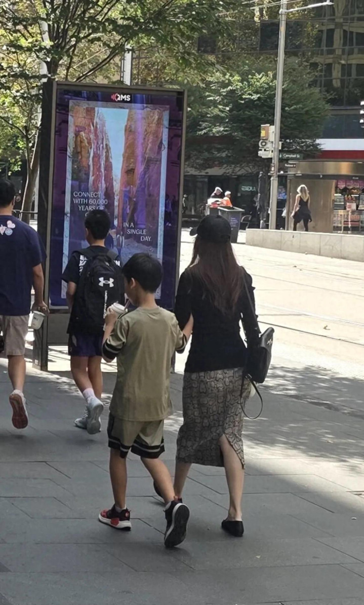 侯佩岑带着小儿子在悉尼逛街, 她背爱马仕双肩包很青春, 儿子帅气