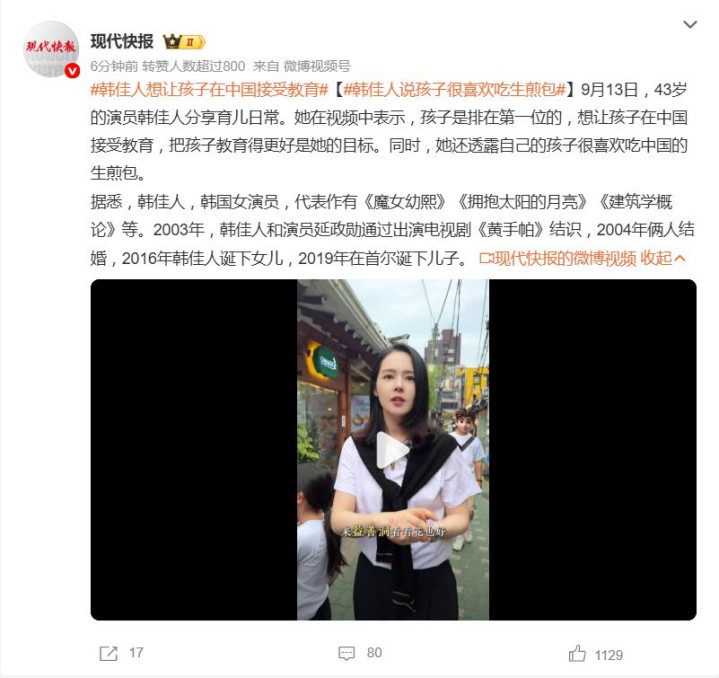 9月16日有媒体报道,43岁的韩国知名演员韩佳人在一段视频中坦言“孩子是第一位的”,并高调宣布计划让孩子来中国接受教育,称这是她当前人生的重要目标,“要将孩子教育得更好”。此言一出,瞬间引发中韩网友热议——这是直接“托付未来”了。
