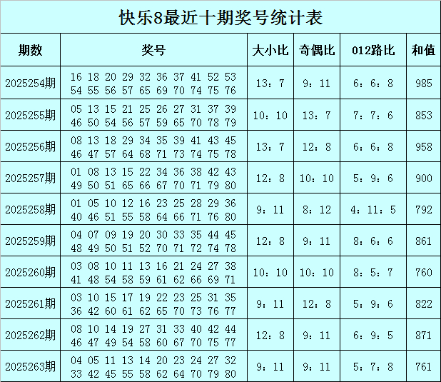 福彩快乐8第2025263期开奖回顾:04 05 11 13 14 20 23 24 27 32 33 42 45 55 58 62 64 70 79 80,其中奖号奇偶比开出9:11,大小比开出9:11,012路比开出5:7:8,和值为761,跨度为76。