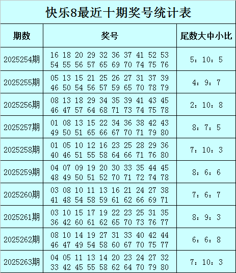 福彩快乐8第2025263期开奖回顾:04 05 11 13 14 20 23 24 27 32 33 42 45 55 58 62 64 70 79 80,其中包含7个小尾奖号:11、20、32、42、62、70、80;包含10个中尾奖号:04、05、13、14、23、24、33、45、55、64;包含3个大尾奖号:27、58、79。