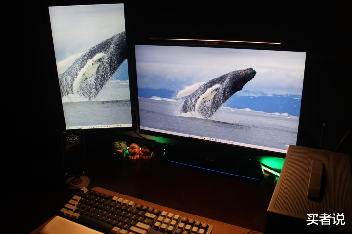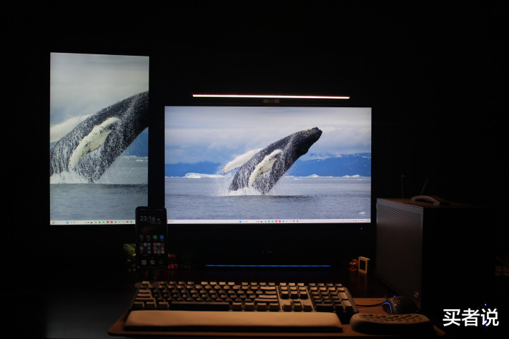 在全暗光环境下,屏幕挂灯可以非常好的覆盖键鼠区域,同时屏幕也不会出现反光的现象。