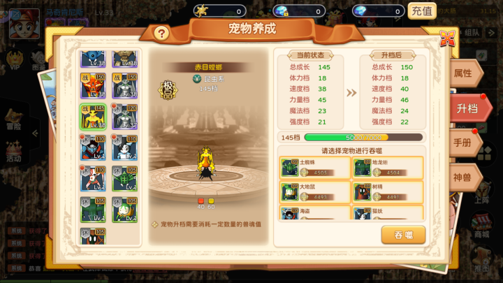 除了吞噬同类宠物,游戏还引入了关键道具——兽魂丹。这种特殊的丹药是宠物战力飞跃的核心催化剂。吞噬兽魂丹能为目标宠物提供远超吞噬普通宠物所能获得的、更为显著的战力加成,甚至可能解锁特殊属性或能力。兽魂丹的获取通常更具挑战性或需要特定资源兑换,使其成为玩家进行战略性培养、重点突破宠物战力瓶颈的珍贵资源。它大大丰富了培养策略的深度,让玩家在资源分配和目标选择上拥有更多元的考量。
