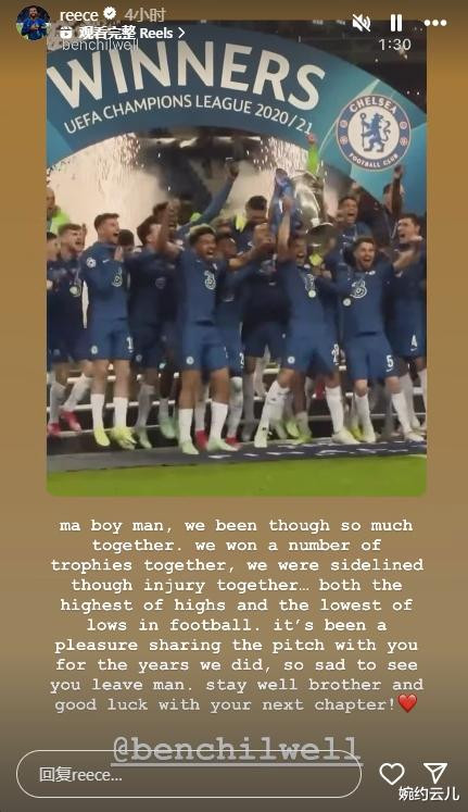 在切尔西的辉煌历史中,有许多功勋球员,如果不是因为伤病,奇尔维尔还可以继续在蓝桥征战。上赛季结束后,奇尔维尔和詹姆斯是切尔西阵中最后的两位欧冠冠军成员。今夏,奇尔维尔永久转会离队,蓝军队长詹姆斯在社交媒体上深情告别这位并肩作战多年的兄弟,话语中满是对过往岁月的怀念与不舍。两人都曾因伤缺席很长时间,从足球生涯中的巅峰到伤病影响低谷,两位核心球员并肩走过,如今奇尔维尔离队,的确是有一些感伤的。