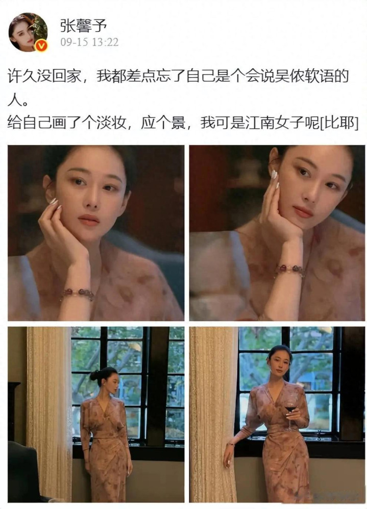 9月15日,张馨予在社交平台分享的动态可太甜了,她发了几张美照,还配文说“许久没回家,都差点忘了自己是个吴侬软语的人” ,一看就是想家好久了。