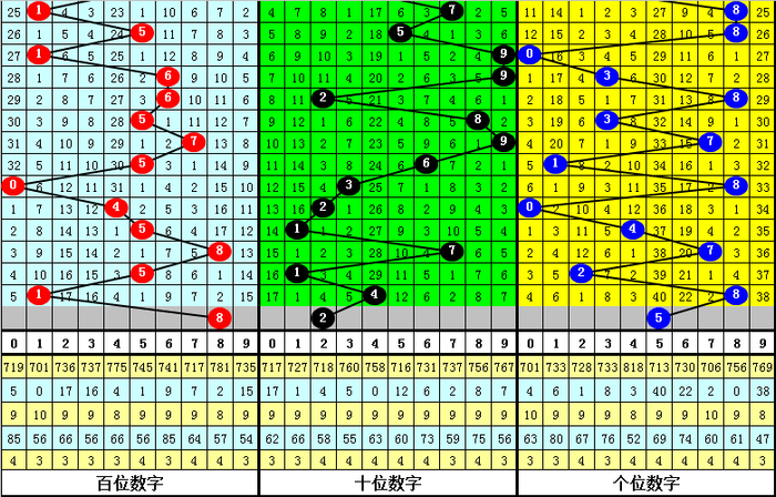 其中,百位奇偶比为2:3,大小比为3:2,本期百位一码参考8。