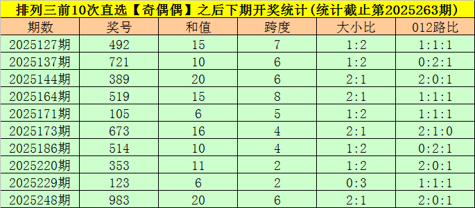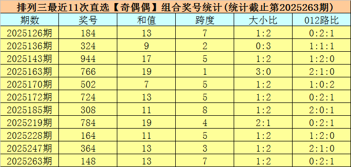 开奖回顾:排列三第2025263期开出奖号:148,类型为组六,和值为13,奇偶比为1:2,大小比为1:2,跨度为7。