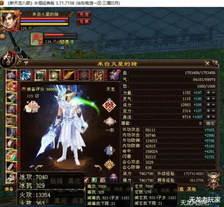 再来看看面板:血量175万,蓝量8.9万,命中15.8万,闪避5.2万,会心攻击3226,会心防御638,冰玄毒三属性都是7000,主火攻击13354!总属性2.4万!